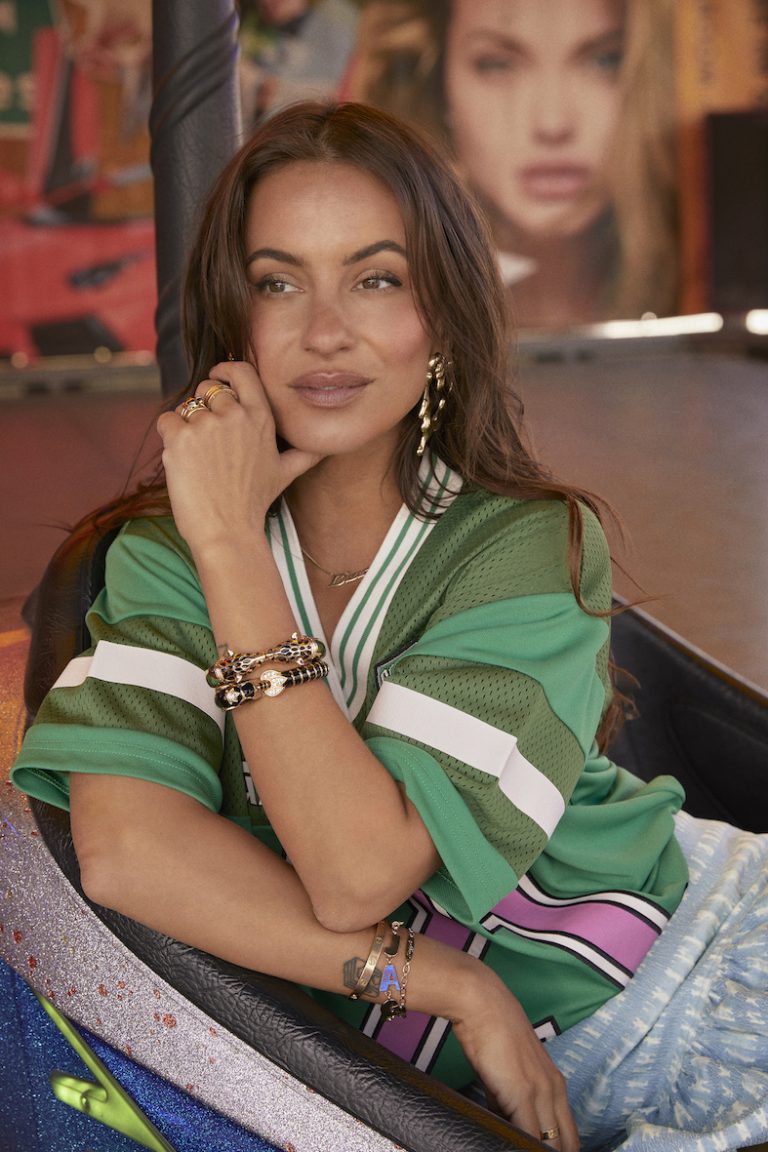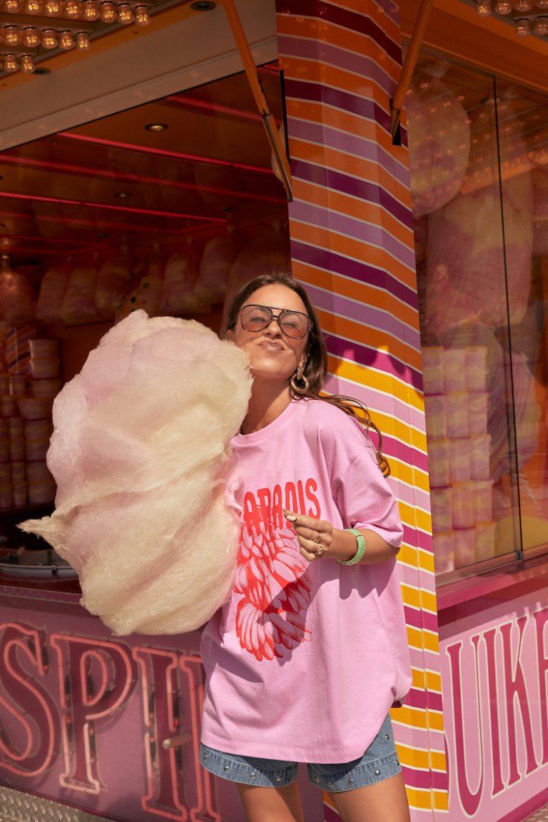 De naam zegt het al: deze collectie draait om plezier, kleur en creatieve combinaties. Mix & match is key. Van felgeel tot roze – elke kleur mag, alles kan. Denk grote strikken op blazers, ballonrokken, sporty girly tops en statement accessoires die je outfit in één keer afmaken. Lizzy’s favoriete piece? De kleurrijke baseball tee, oversized gedragen voor die nonchalante cool-girl vibe. Ook opvallend: de paillettenrok, die net zo goed werkt voor een summer night out als voor een beach lunch. En met must-have sieraden zoals de pearly shell necklace en leopard bangle, maak je iedere look af zoals alleen Lizzy dat kan.