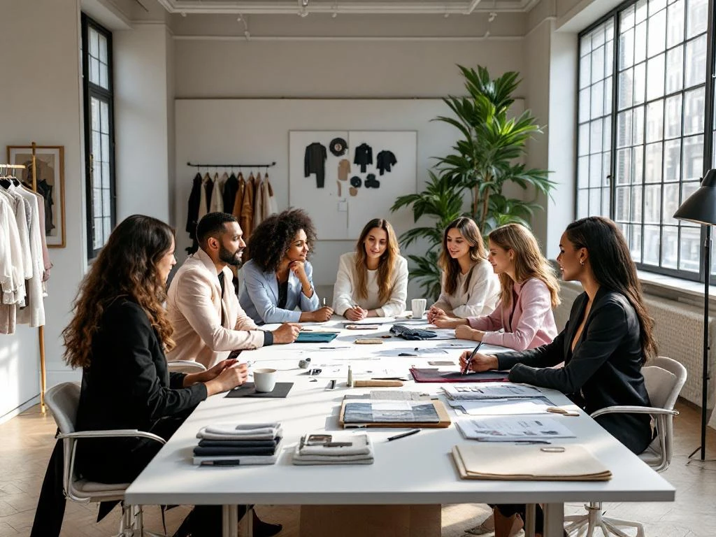 Modeprofessionals bespreken ontwerpen rond conferentietafel met stofstalen en moodboards in stijlvolle studio